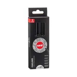 Uni Mitsubishi Astuccio Pin Fineliner Nero - 5 Gradazioni, Inchiostro Pigmentato, Fusto in Plastica con Cappuccio Antisoffocamento