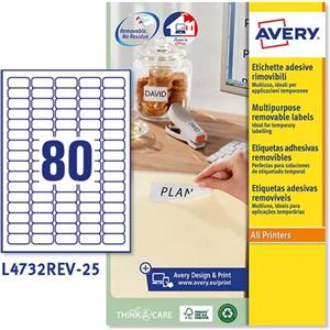 Avery Etichette Bianche Rimovibili 35,6x16,9 mm - 80 Etichette per Foglio - Confezione da 25 Fogli per Stampanti Laser e Inkjet