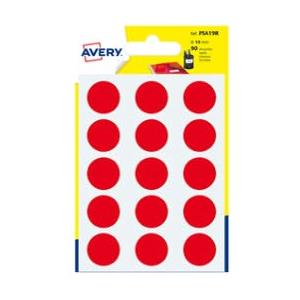 Avery Etichette Adesive Rotonde Rosse Ø 19 mm - 15 Etichette per Foglio - Scrivibili a Mano - Bustina da 6 Fogli - PSA19R