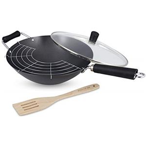 Ken Hom Excellence Wok Antiaderente 31 cm in Acciaio al Carbonio - Set di 4 Pezzi, Compatibile con Induzione e Utensili in Metallo, Lavabile in Lavastoviglie, 5 Anni di Garanzia