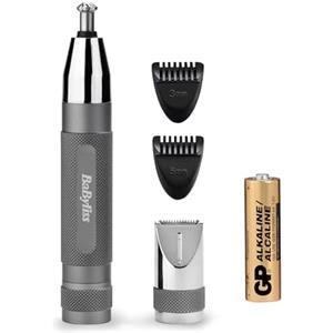 BaByliss E116E Trimmer Rifinitore di Precisione per Naso, Orecchie e Sopracciglia, Acciaio Inox, A Batteria, 2 Accessori Intercambiabili, Design in Metallo Premium