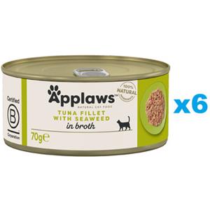 Applaws Alimento Umido per Gatti Adulto - Filetto di Tonno con Alga Marina in Brodo, Naturale e Senza Glutine, 6 x 70g