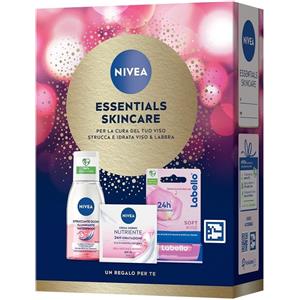 NIVEA Essentials Skincare Kit - Cofanetto regalo donna con Crema Viso Idratante Nutriente 50 ml, Struccante Occhi Waterproof 125 ml e Burrocacao Labbra Labello Soft Rosé 4.8 g