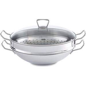 Fissler Nanjing Padella Wok 36 cm in Acciaio Inox con Coperchio in Vetro e Inserto Vaporiera, Ideale per Cottura al Vapore e Induzione