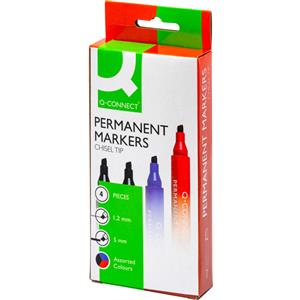 Q-Connect Marcatore Permanente Punta a Scalpello 1,2 - 5 mm Assortiti (Conf. da 4 Colori: 2 Nero, 1 Rosso, 1 Blu)