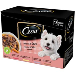 Cesar Selezione in Salsa - Alimento Umido Completo per Cani Adulti, 12 Bustine da 100g con Pollo, Verdure, Manzo e Carote