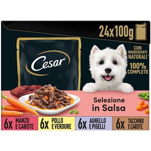 Cesar Selezione in Salsa Multipack - Alimento Umido Completo per Cani Adulti - 24 Bustine da 100g in 4 Gusti