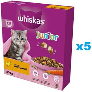 WHISKAS Junior Alimento Secco Completo per Gattini con Pollo - 5x800g, Crocchette Croccanti e Ripieno Tenero