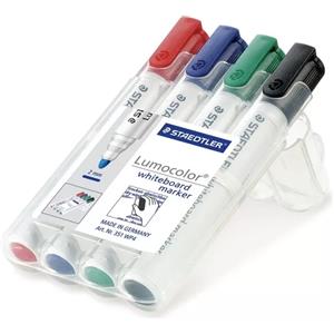 Staedtler Lumocolor 351 B WP4 - Set di 4 Pennarelli per Lavagne Bianche, Colori Assortiti, Punta Tonda, Tratto 2 mm, Cancellabili e Utilizzabili su Vetro e Porcellana