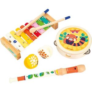 Janod Set Musicale Gioia - 4 Strumenti Musicali in Legno per Bambini dai 18 Mesi - Gioco Educativo con Xilofono, Nacchere, Flauto e Tamburello
