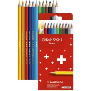 Caran d'Ache Swisscolor - Matite colorate permanenti in confezione da 12 colori assortiti, mina morbida da 2.8 mm, legno di cedro FSC®