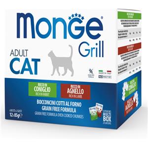 Monge Grill Adult Cat Multipack - Cibo Umido per Gatti - 12 Buste da 85 g (Coniglio e Agnello) - Grain Free e Ricco in Omega 3