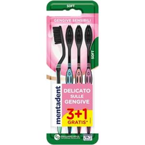 Mentadent Spazzolino Gengive Sensibili - Setole Morbide, Collo a 3 Angoli, Testina con Pulisci Lingua, Confezione da 4 Spazzolini Colorati