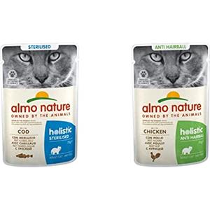 Almo Nature Holistic Sterilised, Cibo umido completo per gatti adulti, Con Merluzzo, Confezione da 30 x 70 g (2100 g) & Cat funzionale della anti-hairball con pollo, 30 x 70 g