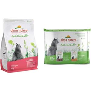 Almo Nature Holistic Anti-Hairball Adult Cat Completo Cibo secco con salmone fresco - 2Kg & Holistic Anti Hairball Multipack con Manzo & con Pollo Cibo Umido Gatto Adulto 6 x 70g cad (Buste)