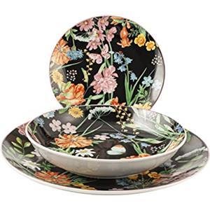 H&H Servizio Tavola 18 Pezzi Caroline Nero - Porcellana con Motivo Floreale, Lavabile in Lavastoviglie e Utilizzabile in Microonde