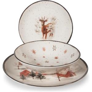 H&H Servizio Piatti Fairy Tale Charm in Stoneware - Set 18 Pz con Decorazione Natalizia, Lavabile in Lavastoviglie e Microonde