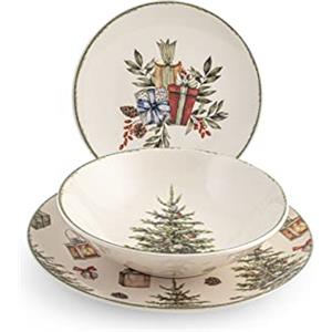 H&H Servizio Piatti Christmas Carol - Set 18 Pz in Stoneware con Design Natalizio, Include Piatti Piani, Fondi e da Frutta