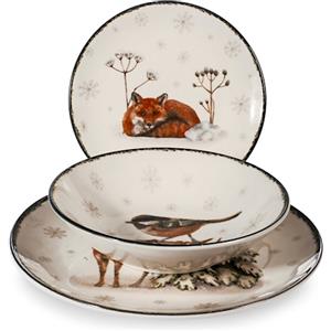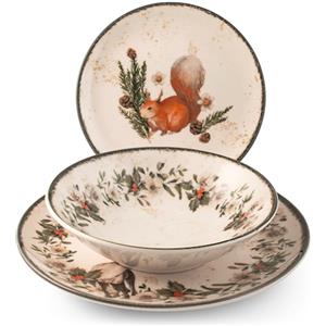 H&H Servizio Piatti Wild Spirits in Stoneware - Set Natalizio 18 Pz con Illustrazioni di Animali, Lavabile in Lavastoviglie e Adatto al Microonde