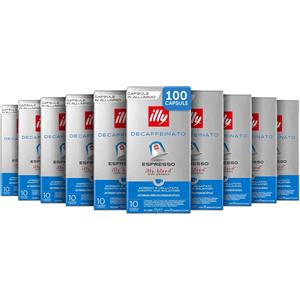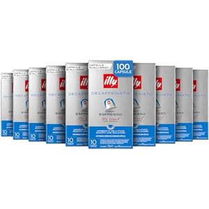 illy, Caffè in Capsule Compatibili in Alluminio DECAFFEINATO, 100% Arabica con Note di Caramello, Cioccolato e Pan Tostato, Senza Caffeina, Gusto Equilibrato, 10 Confezioni da 10 Capsule (100 Totali)