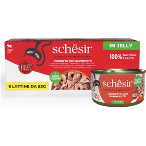 Schesir Cibo Umido per Gatti - Tonnetto con Gamberetti in Filetti e Gelatina, 100% Naturale, Confezione da 6 x 85 g