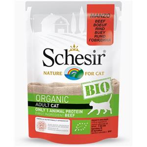 Schesir Bio Cibo Umido per Gatti Adulto al Manzo - Busta da 85 g, Senza Cereali, Alimento Completo e Bilanciato