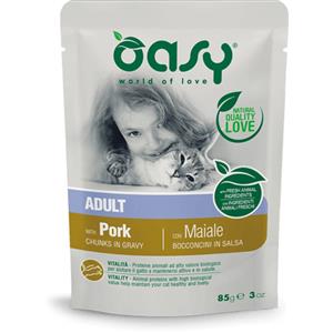 Oasy Bocconcini in Salsa Adult con Maiale - Alimento Umido Completo per Gatti Adulti - 85 Gr