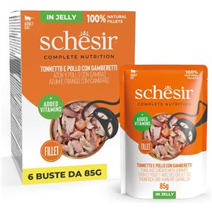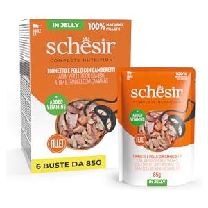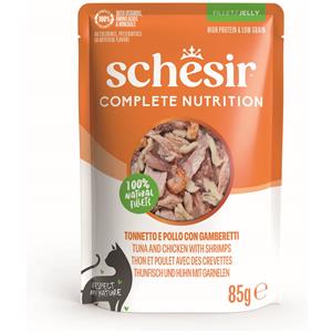 Schesir Complete Nutrition Filetti in gelatina 6 x 85 g in buste - Tonnetto e pollo con gamberetti
