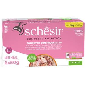 Schesir Cibo Umido Completo per Gatti - Tonnetto con Prosciutto in Gelatina - 6x50g