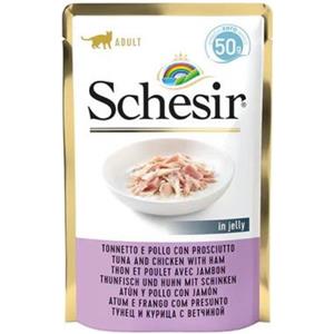 Schesir Cibo Umido per Gatti Adulto - Tonnetto e Pollo con Prosciutto in Gelatina, 50g