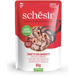 Schesir Alimento Umido Completo per Gatti - Tonnetto con Gamberetti in Gelatina - 12 x 85g, Ingredienti 100% Naturali e Cruelty Free