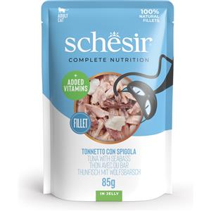Schesir Alimento Umido Completo per Gatti - Tonnetto con Spigola in Gelatina - 12 x 85g - Ingredienti 100% Naturali