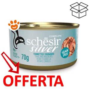 Schesir Silver Cibo Umido Completo per Gatti Anziani - Tonno e Sgombro - 12 Lattine da 70g