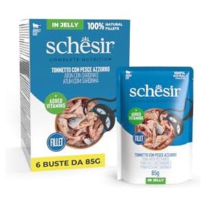 Schesir Tonnetto con Pesce Azzurro in Gelatina - Alimento Umido Completo per Gatti, 6 x 85g, Con Vitamine Aggiunte, 100% Naturale in Alimenti Cani e Gatti