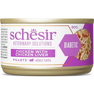 Schesir Veterinary Solutions Diabetic - Alimento umido per gatti adulti con pollo e fegato, 8 lattine da 80 gr