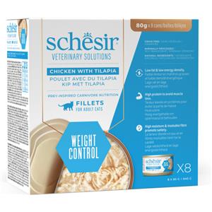 Schesir Veterinary Solutions Weight Control - Alimento Umido per Gatti con Filetti di Pollo e Tilapia, 8 Lattine da 80g