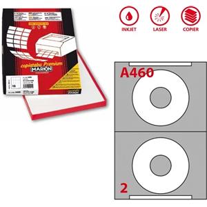 Markin Etichette adesive A/460 bianche - 100 fogli A4, diametro CD 114,5 mm, foro 41 mm, 2 etichette per foglio, permanenti