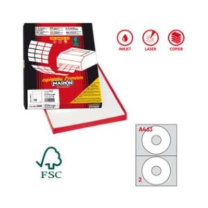 Markin Etichette adesive A/460 bianche - 100 fogli A4, diametro CD 114,5 mm, foro 41 mm, 2 etichette per foglio, permanenti