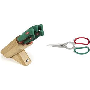 Sanelli 931605 Ceppo Coltelli Leck, Legno, Verde/Rosso, 5 unità & Premana Professional Forbice Cucina, Acciaio Inossidabile, Verde/Rosso, 21.0x1.0x7.5 cm