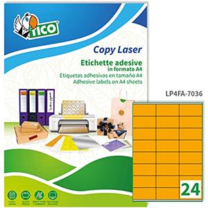 Tico LP4FA-7036 Etichette Adesive Arancioni Fluo 70x36 mm - 24 Etichette per Foglio - Confezione da 70 Fogli A4 - Adesivo Permanente