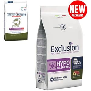 EXCLUSION DIET EXCLUSION VETERINARY DIET Per Cani HYPOALLERGENIC Cavallo e Patata MEDIUM LARGE 12 kg Prezzo x 2 unità