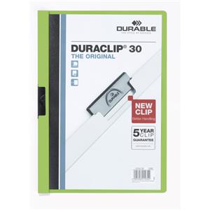 Durable DURACLIP® A4 Cartellina con Clip Verde - Capacità 30 Fogli, PVC di Alta Qualità, Copertina Trasparente, Confezione da 25 Pezzi