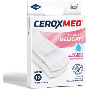 CEROXMED Cerotti Delicati Medi 12 Pezzi - Morbidi, Ipoallergenici e Trasparenti con Garza Disinfettante