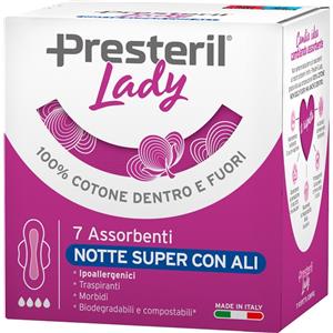 Corman Lady Presteril Assorbenti Notte Super con Ali - 7 Pezzi, 100% Cotone Biodegradabile e Ipoallergenici