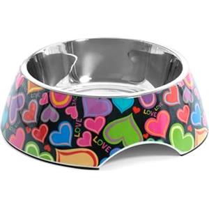 Record Ciotola per Cani e Gatti Lovely - Acciaio Inox e Melamina, Ø 17,5 cm, Capacità 350 ml, Gommini Antiscivolo, Fantasia a Cuori Multicolor