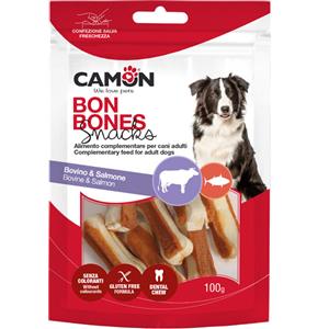 Camon Snack Ossicini Masticabili di Pelle Bovina con Salmone - 100GR, Stimola la Masticazione per Cani Adulti, Senza Coloranti