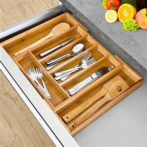 BAKAJI Vassoio Portaposate Estensibile in Legno di Bambù con 5 Scomparti e 2 Scomparti a Scomparsa - Dimensioni 37x31cm
