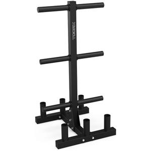 Toorx Rastrelliera verticale porta dischi bumper e bilancieri - 6 manicotti di carico, 4 porta bilancieri, dimensioni 70x70x140,5 cm