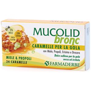 Farmaderbe Mucolid Bronc Caramelle Gola - Miele e Propoli, 24 Caramelle Emollienti per Alleviare Raucedine e Disagi