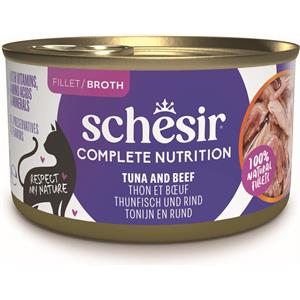 Schesir Alimento Umido Completo per Gatti - Tonnetto con Manzo in Brodo, 6 x 85 g, 100% Naturale con Vitamine Aggiunte